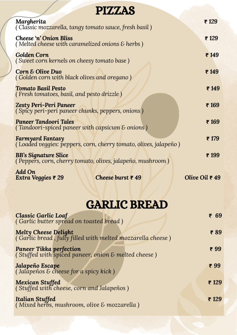 - Pizza: Dive into their Golden Corn Pizza, a delightful combination of sweet corn and creamy cheese, or indulge in the Cheese And Onion Bliss Pizza for a classic comfort.